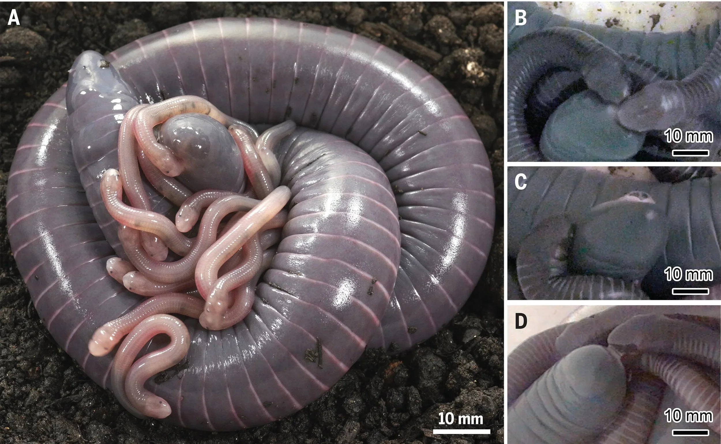 Figure taken from Mailho-Fontana et al. 2024 showing parental care behaviors of the Brazilian caecilian Siphonops annulatus. (A) The distal portion of the mother’s body remains elevated. (B) The hatchlings often show interest in the maternal vent by touching or nibbling on it. (C) Milk being released after stimulation. (D) Milk consumption by one young individual.